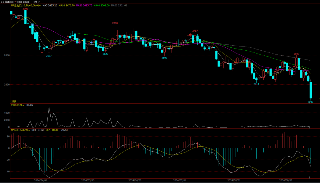 今日烧碱2501主力合约跳水,空头大幅加仓,主连合约创单日最大跌幅,收盘2501合约报2306元/吨,跌幅5.45%。