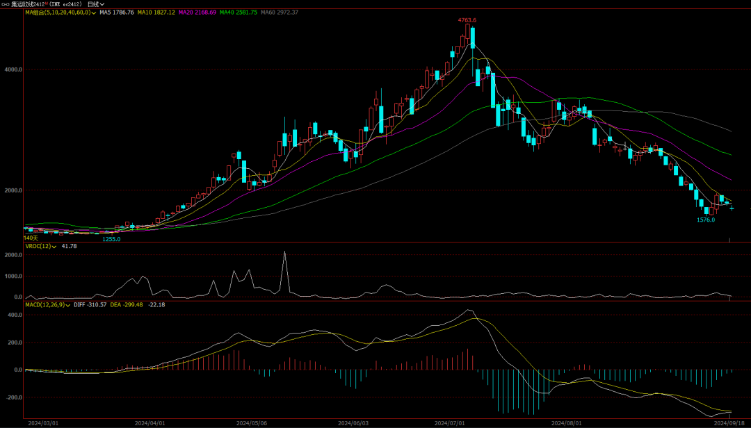现货运价加速下行,市场偏弱情绪进一步加剧,今日集运近月合约跌势显著,主力EC2412合约收于1692点,跌幅达6.19%。